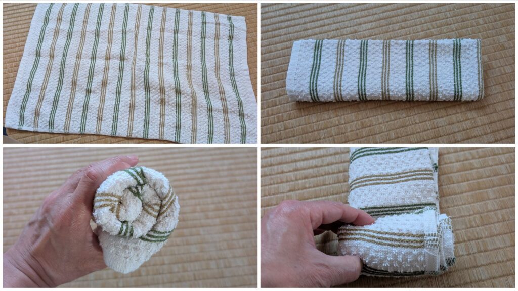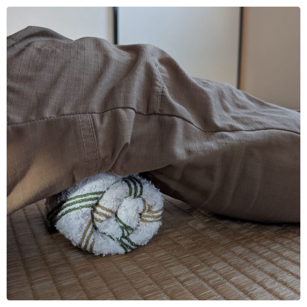 - 膝の下にタオルを丸めて置く 膝の裏に、くるくると丸めたフェイスタオルを置きます。