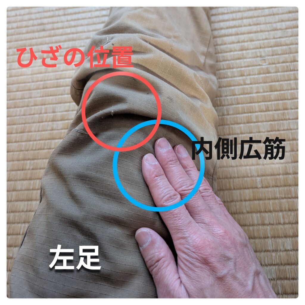 - 内側のポコッとした盛り上がりを確認 膝のお皿の内側あたりに、キュッと力が入って盛り上がるのを確認してください。そのまま5秒キープ。